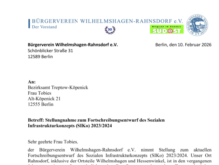 Liebe Vereinsmitglieder, kürzlich haben wir als Bürgerverein “Wilhelmshagen-Rahnsdorf e.V.” über die Fortschreibung des Sozialen Infrastrukturkonzepts des Bezirksamtes T/K für unsere Region informiert. Eingabeschluss war der 11. Februar 2026. Wir bedanken uns bei allen Mitgliedern...