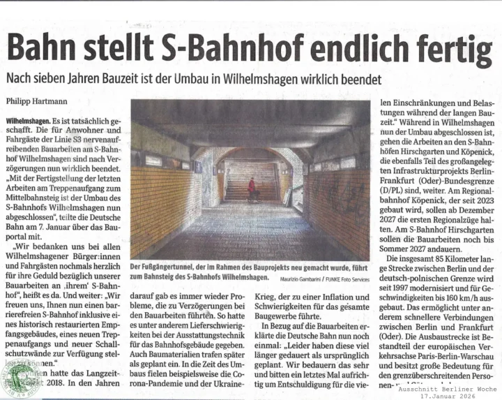 Berliner Woche meldet in der Ausgabe vom 17.Januar 2026 die Fertigstellung des S-Bahnhofs Wilhelmshagen