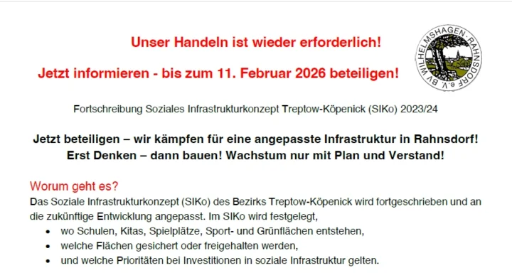 Unser Handeln ist wieder erforderlich!Jetzt informieren – bis zum 11. Februar 2026 beteiligen!Fortschreibung Soziales Infrastrukturkonzept Treptow-Köpenick (SIKo) 2023/24Jetzt beteiligen – wir kämpfen für eine angepasste Infrastruktur in Rahnsdorf!Erst Denken – dann bauen! Wachstum nur...